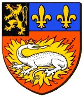 Notez que la belle tour donjonnée d'origine à été remplacée par l'église du lieu qui est celle d'une célèbre abbaye. L'Armorial Général de France a maintenu le lézard (si, si, c'est un lézard, on distingue ses écailles ! ) mais tenu dans les serres d'une aigle.