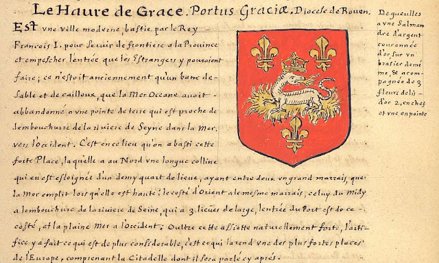 Notez le nom d'origine "Le Havre de Grâce" donné à la création de la ville et du port pendant le règne du roi François Ier (en 1517) , qui explique la présence de la salamandre , emblème (badge) personnel de ce roi. Pour C.R d'Hozier, il y a apparemment une confusion avec le blason d'Harfleur, la cité voisine (voir ci-dessous).