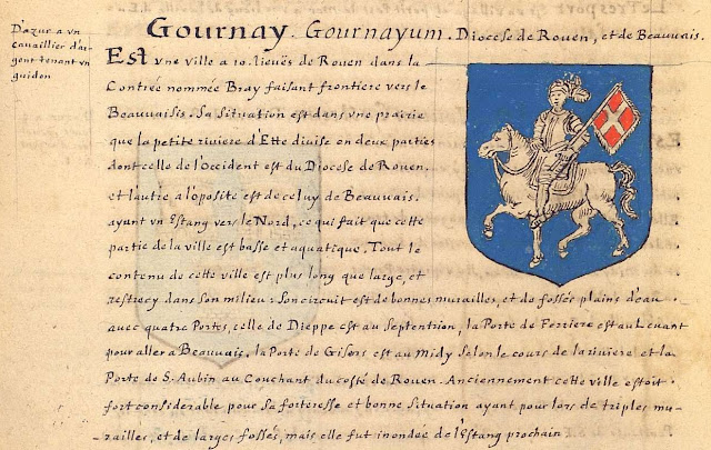 On notera que le cavalier en armure, qui est Eudes, le premier seigneur de Gournay au Xe siècle, mais représenté ici avec une armure du XVIe siècle, et qui a perdu sa monture dans l'Armorial Général de France ! De nos jours le blason est fixé avec un champ de sable ( "le chevalier à l'écu noir" était le surnom de Eudes) , le cavalier contourné et surmonté d'une fleur de lys d'or.