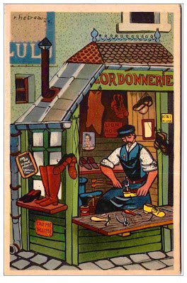 Puis, plus rares, quelques cordonniers en activité sur leur table de travail , dans la rue ou en intérieur, et l'un d'entre eux (24) sous la protection de la Sainte Vierge dans le Ciel ! :