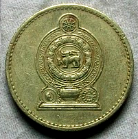 - L'emblème actuel qu'on peut comparer à des armoiries si on est large d'esprit en matière d'héraldique, date de 1972. Dans la partie centrale, le lion d'or portant une épée est l'emblème du vieux royaume de Kandy (voir plus bas), à l'intérieur d'un disque de gueules avec une bordure composée de pétales de fleur de lotus dorés disposés entre deux cercles d'azur. Les pétales de lotus sont entourés d'une couronne d'épis de riz qui sortent d'un récipient situé dans la partie inférieure du blason. Aux côtés de ce récipient, sont représentés, figurés (avec une figure humaine), la Lune et le Soleil qui sont des symboles de longévité.Dans la partie supérieure du blason figure le Dharma chakra, la "Roue du devoir" qui est un symbole bouddhiste, comme celui déjà vu en Inde, précédemment.