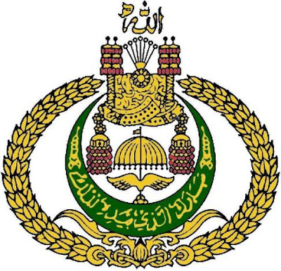 - Étant donné que l'état est indissociable de son monarque, le Sultan, voici son emblème personnel ci-dessous, avec le trône royal, le nom d'Allah sur le croissant, et ceint d'une couronne de riz.