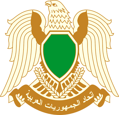 | armoiries de la Jamahiriya arabe libyenne populaire et socialiste le faucon de Quraych (c'est son nom) précédent tourne maintenant la tête à gauche et supporte un écu de sinople plain lui aussi. |