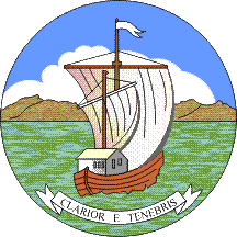 | badge avec le bateau de C. Colomb et la devise latine signifiant : "la clarté dans les ténèbres" |