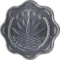 - L'emblème du Bangladesh, est un sceau , adopté en 1971, et montre le caractère "aquatique" du pays soumis à la mousson, aux cyclones et aux inondations répétées et catastrophiques. Dans un cercle , une fleur de nénuphar ( Nymphaea hybrida) posée sur des ondes représentant le Gange, encadrées par des guirlandes d'épis de riz, surmontées de quatre étoiles et d'une capsule (enveloppe des graines) de jute (Corchorus capsularis), le tout d'or. Les quatre étoiles symbolisent, comme une sorte de devise, les quatre principes de l'État : le patriotisme, la démocratie, le socialisme et la laïcité. Elles représentent aussi les quatre grandes régions du pays : Chittagong, Dhaka, Khulma and Rajshah.