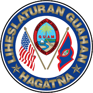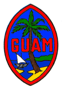 - Le dessin du sceau (seal) actuel de Guam a été proposé en 1946 et approuvé par l'Amiral U.S. Charles Alan Pownall , ancien Gouverneur de l'île. Il représente le paysage stylisé d' Agaña Bay, près de Hagåtña, avec une embarcation locale nommée "prao" et un cocotier. La forme en amande du sceau est celle d'une pierre de fronde des Chamorros, la population autochtone, utilisée comme une arme de guerre et de chasse. A droite le sceau du petit Parlement de l'Etat portant le nom en chamorro : I Liheslaturan Guåhan et le nom de la capitale Hagåtña où il siège.