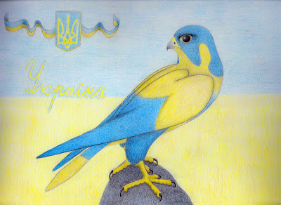 Le nom de l'Ukraine est dérivé de Ukraina, mot apparu pour la première fois en 1187. Il existe plusieurs théories sur l'étymologie : des historiens ukrainiens traduisent le terme "u-kraina" comme, "terre natale" ou "notre pays". Mais aussi, le mot est dérivé de "u-kraina", au sens de «région intérieure», «terre intérieure» ou «pays à l'intérieur du pays». Ce mot a la même racine que "kraj", qui signifie «bord, frontière», ou «région frontalière» et désigne aujourd'hui une division administrative régionale dans les pays slaves. L'Ukraine a été le premier État slave oriental, fondé par les Varègues (scandinaves): la Rus' de Kiev (appelée aussi dans les écrits occidentaux Ruthénie), qui durant les Xe et XIe siècles fut l'État le plus grand et le plus puissant d'Europe. L'Ukraine c'est aussi le pays des légendaires Cosaques, il y a eu d'ailleurs un état Cosaque. Après une domination Lituano-polonaise dès le XIVe siècle, à partir XVIIe siècle la région correspondant à l'actuel territoire ukrainien est conquise et divisée en de multiples gouvernorats et provinces en grande partie russes, et quelques-uns autrichiens. Enfin, le pays sera intégré dans l'Union Soviétique en 1920, il souffrira énormément du stalinisme (famine) et n'accèdera à une vraie indépendance qu'en 1991. Toutefois l'unité du pays est mise à mal par les dissensions entre partisans pro-européens et pro-russes, d'abord avec la Révolution Orange en 2004/2005 puis récemment : les manifestations de la Place Maidan à Kiev en février 2014, la sécession de la Crimée, rattachée à la Russie en mars 2014 et un début de guerre civile dans l'est du pays russophone, dans la région de Donetsk et Louhansk depuis le mois d'avril 2014. Deux nouveaux territoires ont engagé leur séparation de l'Ukraine et se sont autoproclamés indépendants : les Républiques populaires de Donetsk et de Lougansk. Une nouvelle escalade encore plus dramatique se produit le 24 février 2022: la Russie, par la voix de son président devenu un sinistre dictateur paranoïaque, avec le prétexte de la reconnaissance officielle des deux républiques sécessionnistes, déclare la guerre, bombarde et envahit l'Ukraine quelques jours plus tard. Le pays débordé de toute part résiste comme il peut avec courage sous le regard impuissant du monde entier.- Le blason actuel de l'Ukraine a été officiellement adopté le 26 juin 1996. Il est formé d'un écu d'azur bordé d'une filière d'or, chargé du signe appelé "trident " d'or (ou Tryzub : Тризуб en ukrainien). C'était déjà le symbole national durant la courte période pendant laquelle le pays avait été indépendant précédemment (1917-1920). Mais, en fait il est beaucoup plus ancien que cela ! plus de mille ans. Il provient du "chiffre", qui est un monogramme ou une composition préhéraldique, lié à la dynastie des Riourikides, monarques en place depuis le Xe siècle (voir historique, plus bas), et en particulier pour Volodymir ou Saint Vladimir le Grand (~958-1015), Prince de Kiev. En fait de trident, on pense qu'il s'agit plutôt de la représentation d'un faucon en chasse, piquant vers le sol, figuré ainsi de manière très stylisée, à la façon des gravures runiques scandinaves. Le faucon faisait partie des divinités naturelles pour les peuples slaves.