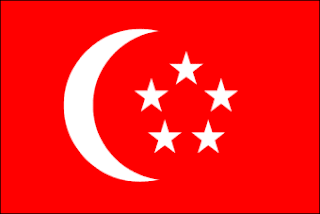 - Comme les armoiries et dans le même contexte de statut d'autonomie, le drapeau de Singapour a été adopté en 1959 et est devenu le drapeau national en 1965. Il est composé de deux bandes horizontales. La bande supérieure est rouge et la bande inférieure est blanche, comme celui de l'Indonésie. Il reprend les éléments du blason dans le canton gauche de la bande rouge : le croissant et les cinq étoiles composant un pentagone, le tout d'argent, mais le croissant est renversé sur le côté droit (contourné). A droite ci-dessous, nous voyons l'étendard présidentiel reprenant le canton supérieur gauche du drapeau national.