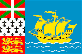 Le territoire de Saint-Pierre-et-Miquelon est un archipel français d'Amérique du Nord, au Sud de Terre-Neuve, formant une collectivité d'outre-mer. L'archipel est formé de l'île Saint-Pierre (26 km²) et de Miquelon (216 km²), qui est elle-même constituée en fait de deux îles reliées par un isthme sableux : Miquelon, ou Grande Miquelon, et Langlade, ou Petite Miquelon. C'est le navigateur Jacques Cartier qui nomma l' "Isle Sainct Pierre" lors de son passage en juin 1536 ; saint Pierre étant le saint patron des pêcheurs. Le nom de Miquelon serait d'origine basque, donné par les pêcheurs de cette région et viendrait du nom Mickaël mais sans certitude car il n'y a pas de traces écrites. L'archipel est l'unique vestige restant de l'immense colonie royale de la Nouvelle-France qui allait du Canada et de l'Acadie jusqu'en Louisiane en passant par les Grands Lacs. Tous ces territoires ont été perdus par la France au bénéfice de l'Espagne ou de la Grande-Bretagne en 1763 suite à la Guerre de Sept Ans (1756-1763).- Les armoiries de Saint-Pierre-et-Miquelon sont composées d'un écu au champ d'azur chargé d'un navire (caraque) d'or voguant sur la mer représentée par des vagues d'argent ; chef tiercé au premier à l' Ikurriña ou drapeau de la nation basque, au second d'hermines plain de Bretagne et au troisième de gueules à deux léopards d'or, armés et lampassés d'azur de Normandie. Timbré d'une couronne navale d'or , soutenu de deux ancres marines de sable posées en sautoir et dans la partie inférieure un listel d'argent où est inscrite la devise en latin : “A mare labor” (De la mer, du Travail). Le navire fait référence à la La Grande Hermine avec laquelle Jacques Cartier est arrivé à Saint-Pierre le 15 juin 1536. Les drapeaux du Pays basque, de la Bretagne et de la Normandie font référence aux origines de la majeure partie de la population des îles.