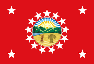 - En-dessous, le drapeau du Gouverneur de l'État, rouge, est chargé du sceau de l'État entouré par 13 étoiles représentant les treize premiers états fondateurs des États-Unis plus quatre étoiles dans chaque coin, attribuées à la fonction de Gouverneur.