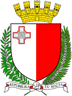L'écu est timbré avec une couronne murale d'or à cinq tours, placées en encorbellement. Le blason apparaît entouré par une couronne composée de deux rameaux, d'olivier à dextre et de palmier à senestre, symboles de la paix et du sacrifice. Les deux rameaux sont unis par une banderole nouée d'argent avec la dénomination officielle du pays en maltais "Repubblika ta' Malta" (« République de Malte »).