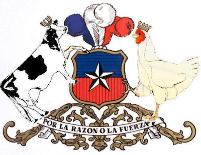 - Les armoiries du Chili ont été instaurées par la loi du 26 juin 1834, et dessinées par Carlos Wood Tailor, un britannique. La blason en forme de plastron est "coupé, d'azur cousu de gueules à l'étoile à cinq branches d'argent brochant". L'écu est supporté à dextre par un huemul (Hippocamelus bisulcus), et à senestre par un condor des Andes (Vultur gryphus), les deux au naturel qui portent sur leur tête une couronne navale d'or. Il est timbré par un tortil surmonté d'une huppe à trois plumes d'autruche, de gueules, d'argent et d'azur, qui rappelle une distinction que portaient les anciens présidents Chiliens. En dessous, on peut voir une banderole d'argent sur laquelle apparaît la devise nationale : "Por la razón o la fuerza" (Par la raison ou par la force) plaquée sur un entrelacs de rinceaux d'or, soutenant les armoiries.