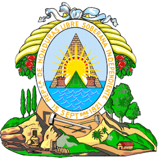 Blason : dans l'écu central de forme ovale, apparaissent sous un ciel azur, parsemé d'étoiles, sur une terrasse verte et devant la mer, une pyramide (formant un triangle) et deux tours sur le sommet desquelles figure un arc-en-ciel qui symbolise la paix, l'union de la société hondurienne et l'élévation des idées. Le triangle signifie la parfaite égalité de tous les Honduriens devant la loi, tous sont égaux en droits et que chacun a les mêmes obligations. Les tours, l'une sur les rives de la mer des Caraïbes et l'autre dans le golfe de Fonseca (sur l'océan Pacifique), représentent les défenses courageuses dont ont fait preuve les peuples aborigènes face aux conquistadors espagnols.. Sous l'arc en ciel, sont un soleil se levant, symbole de l'espoir et un volcan entre les deux océans (Atlantique et Pacifique), qui représente le territoire hondurien ; le volcan rappelle aussi qu'il appartenait au groupe des cinq volcans qui étaient représentés, dans le triangle équilatéral de l'emblème des Provinces-Unies d'Amérique centrale. Le bonnet phrygien avec des rayons lumières, qui était apparu initialement sous le ciel et au-dessus du volcan , entre les deux tours, a été remplacé par un soleil levant.Le soleil levant, sous l'arc en ciel diffuse la lumière et éclaire l'horizon faire ressortir la beauté du pays. Il symbolise la liberté, le patriotisme et l'espoir, vertus que le chef amérindien Lempira avait incarné avant de mourir dans les mains des vainqueurs.