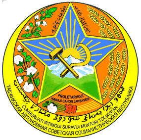 | Emblème de la R.S.S du Tadjikistan en 1929, après séparation de de la R.S.S d'Ouzbékistan dans laquelle elle était intégrée auparavant en tant que Région autonome (R.A.S.S) |