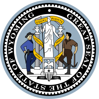 - Le grand sceau de l'État du Wyoming a été adopté en 1893, puis révisé par la loi en 1921. Les deux dates figurant sur le sceau, 1869 et 1890 commémorent la première l'organisation du gouvernement Territorial et la seconde l'admission du Wyoming dans l'Union. Au centre, une statue drapée tient une hampe avec une bannière portant les mots "Equal Rights" (égalité des droits) qui est la devise de l'État. Cette figure symbolise le statut politique des femmes qui ont toujours joui du droit de vote dans le Wyoming depuis 1869. Les deux hommes à ses côtés représentent l'agriculture et l'industrie minière de l'État. Sur le haut des colonnes on voit des lampes à huile qui brûlent et représentent la "Lumière de la Connaissance". Les rouleaux de parchemin encerclant les deux colonnes portent les mots : "Oil, Mines, Livestock, Grain" (Pétrole, Mines, Bétail et Grain), quatre des productions les plus importantes du Wyoming. Sous la statue posée sur un piédestal, figure les armes très simplifiées des États-Unis avec une seule étoile portant théoriquement le chiffre 44, le Wyoming étant le 44e état ayant adhéré à l'Union. Enfin, un cercle noir entoure le tout avec l'inscription "• Great Seal of the State of Wyoming •". Ci-contre à droite : le sceau du Gouverneur, très semblable.