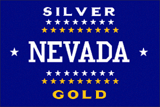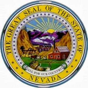 - Le sceau de l'État du Nevada (ci-contre : le modèle présent sur le site web du Gouvernement du Nevada) qui dérive du sceau de l'ancien Territoire du Nevada (voir historique plus bas), le personnage central, un mineur tenant un drapeau, en moins. Il a été élaboré en vue du nouveau statut d'État en 1864. C'est chose faite le 31 octobre 1864, par la proclamation du Président Abraham Lincoln. Puis le 24 février 1866, l'ancienne devise "Volens et Potens" (volontaires et capables) est remplacée par "All for Our Country" (tout pour notre pays). On y voit tout un paysage très réaliste dans un tableau circulaire, et nous voilà encore une fois à des années-lumières des règles et de l'esthétique épurée de l'héraldique ! Mais nous sommes en Amérique et les conventions de la vieille Europe n'ont plus cours ici, dans les états de l'Ouest...