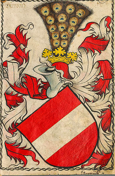 | Armoiries du Duché d'Autriche au armes de la maison de Babenberg (de gueules à la fasce d'argent) Scheibler'sches Wappenbuch - BSB Cod.icon.312c Sud Allemagne - établi de 1450 au XVIIe siècle |