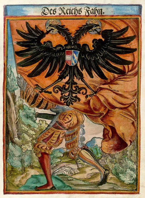 | "Des Reichs Fahn" - Le drapeau impérial avec l'écusson des Habsbourg, ducs de Bourgogne tels que Maximilien Ier (règne 1508-1519) manuscrit illustré par Jakob Koebel (Saint Empire) - 1545 |