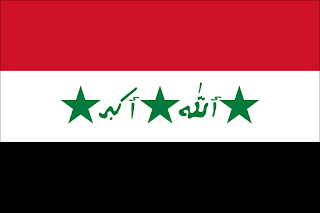 - Le drapeau actuel de l'Irak été mis en service le 22 janvier 2008. Comme pour les armoiries, il est la quatrième évolution du drapeau national adopté en 1963. Il est composé de trois bandes horizontales rouge (au-dessus), blanche et noire, reprenant ainsi les couleurs panarabes. La bande blanche est chargée de la devise , le Takbir : "Allah akbar" ( Dieu est le plus grand ), en calligraphie coufique (de la ville de Kufa, près de Nadjaf) et typique des musulmans chiites. Le Parlement irakien avait adopté ce drapeau national provisoire qui ne devrait flotter au-dessus des bâtiments publics que pendant un an, le temps que les députés se mettent d'accord sur un drapeau national définitif. Les trois étoiles qui figuraient précédemment ont été supprimées (voir historique, plus bas).