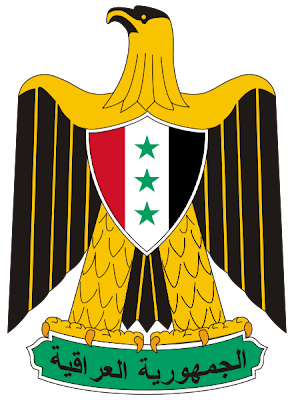 - Les armoiries de l'Irak ont été adoptées le 2 juillet 1965, mais ont subi au moins trois modifications depuis, la dernière date de 2008. Ces modifications ne touchent que l'écu central qui s'adapte au drapeau national contemporain. Elles montrent un écusson tiercé en fasce de gueules, d'argent avec une inscription en arabe coufique “Allahu Akbar” (Dieu est le plus grand) de sinople, et de sable, les couleurs du drapeau national. Il est soutenu par l'aigle de Saladin d'or , aux plumes de sable, la tête tournée vers sa droite et tenant dans ses serres un parchemin de sinople avec l'inscription en arabe " الجمهورية العراقية " (Al-Jumhūriyya al-‘Irāqiyya - République d'Irak). Cet emblème est très similaire à celui de l'Égypte et la référence symbolique a la même origine et la même controverse historique ( voir le sujet sur l'Égypte).