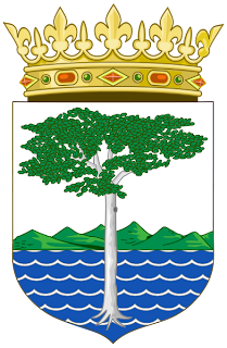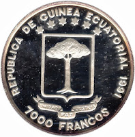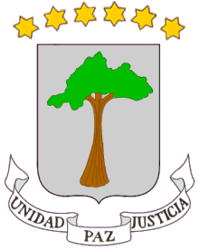 - Les armoiries de la Guinée Équatoriale ont été approuvées le 12 octobre 1968. Elles sont très simples et reprennent en grande partie le blason colonial du Rio Muni (voir historique, plus bas). Elles sont composées d'un écu au champ d'argent chargé d'un arbre arraché de sinople fûté au naturel. L'écu est surmonté de six étoiles d'or à six branches, disposées en arc de cercle et soutenu d'une banderole d'argent avec une inscription en lettres de sable qui est la devise nationale en espagnol : “UNIDAD • PAZ • JUSTICIA” (Unité, Paix, Justice).