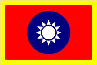 - Le drapeau de la République de Chine est rouge avec un canton de couleur bleu marine sur lequel est dessiné un soleil blanc avec douze rayons triangulaires. En Chinois, le drapeau est communément appelé "Ciel bleu, Soleil blanc et Terre entièrement rouge" (chinois simplifié : 青天, 白日, 满地红 - Qīng Tiān, Bái Rì, Mǎn Dì Hóng) afin de refléter ses caractéristiques. Il est utilisé la première fois en Chine continentale par le Kuomintang, le parti nationaliste chinois, en 1917 et devient le drapeau officiel de la République de Chine en 1928. Depuis 1949, le drapeau est essentiellement utilisé à Taïwan, Penghu, Kinmen, Matsu et sur les autres îles périphériques où la République de Chine s'est réfugiée après la Guerre civile chinoise contre les Communistes. Ci-dessous à droite : le drapeau civil de Taïwan avec des bandes dentelées jaunes et en dessous celui de la présidence de la République avec l'emblème centré et une bordure jaune.