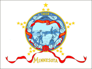 - Le premier drapeau de l'État du Minnesota fut adopté en 1893, et fut créé par Mme Amelia Hyde Center de Minneapolis. Le drapeau était alors de couleur blanche sur son côté frontal et bleu clair sur sa face arrière. En son centre figurait, comme c'est le cas actuellement, le sceau de l'État, mais celui-ci était entouré d'orchidées d'un type différent. De plus, un ruban rouge ornait le bas du sceau, ou était inscrite une devise. Les trois dates étaient de couleur or. Le drapeau actuel du Minnesota fut adopté en 1957, et le sceau à l'intérieur du drapeau fut modifié en 1983. Il est composé du Sceau de l'État en son centre bordé d'une frange dorée, le tout sur fond bleu ciel. Le sceau est orné d'un contour de fleurs symboles de l'État, le cypripède royal (Cypripedium reginae) . Trois dates sont intercalées dans le contour de fleurs : 1858, l'année de l'accession en tant que 32e État à l'union des États américains ; 1819, année de construction du fort Snelling ; et 1893, année de l'adoption du drapeau original. Dix-neuf étoiles sont disposées en cinq groupes équidistants autour du cercle doré entourant le sceau, de telle manière qu'ils forment les cinq branches d'une étoile.