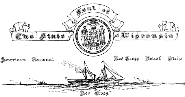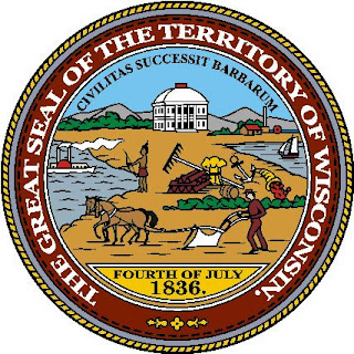 Le nom du Wisconsin provient du mot de langue algonquine, retranscrite par un explorateur français "Ouisconsin" puis anglicisé, attribué également à la rivière du même nom, et qui signifierait à peu près: "lieu de pierres rouges (du grès) où les eaux se rassemblent". Le Wisconsin fut acquis par les États-Unis lors de la conclusion de la Révolution américaine en 1783 mais resta de fait administré par les Britanniques jusqu'à la guerre américano-britannique de 1812. Le Wisconsin a été admis le 29 mai 1848 en tant que 30e État de l'Union.- Le Sceau de l'État du Wisconsin (ci-dessous)contient le blason de l'État (ci-contre). Il a été adopté en 1851 comme le sceau officiel. Description : un écu en plastron d'or écartelé, au premier une charrue au naturel, représentant l'agriculture, au deuxième une pelle et une pioche en sautoir, au naturel, représentant l'exploitation minière, au troisième un bras d'homme tenant un marteau au naturel pour l'industrie, au quatrième une ancre de marine d'argent pour la navigation (sur le Mississipi ou les Grands Lacs) , au cœur sur le tout un écusson aux armes des États-Unis entouré d'une ceinture d'argent avec la devise "E PLURIBUS UNUM" ; timbré d'un tortil d'or et d'azur surmonté d'un blaireau américain (Taxidea taxus) au naturel, l'animal officiel de l'État, et encore au-dessus d'un listel d'argent portant la devise courte de l'Etat : "FORWARD" (En avant). Les tenants sont à dextre un marin et à dextre un mineur, habillés à la mode du XIXe siècle et avec leurs outils à la main ; plus bas à leurs pieds : une corne d'abondance représentant les richesses naturelles et un tas de 13 lingots de plomb, représentent les richesses minérales de l'État, le tout est agrémenté de rinceaux végétaux d'or. Sur le sceau est rajouté encore une banderole chargée de 13 étoiles d'azur symbolisant les 13 États fondateurs de l'Union ainsi que l'inscription en cercle : "THE GREAT SEAL OF THE STATE OF WISCONSIN".