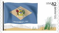 Le drapeau du Delaware a été adopté le 24 juillet 1913 , il est de couleur bleue appelée "bleu colonial" sur les sites américains ! avec au centre un losange de couleur "chamois" où s'inscrivent les armoiries de l'État , soutenu par la date du 7 décembre 1787 ( DECEMBER 7, 1787), jour où le Delaware devint le premier État à ratifier la Constitution des États-Unis d'Amérique. A noter que cette notion très floue de "bleu colonial" qui serait la couleur de l'uniforme que portait le Général George Washington, entraine une variation étonnante de couleurs allant du vert-de-gris au bleu marine , et cela d'une source à une autre! Amusez-vous à cherchez les images du drapeau sur votre moteur de recherche préféré et vous verrez le résultat étonnant, sans compter les diverses proportions fantaisistes du même drapeau qui sont légalement de 3:4.