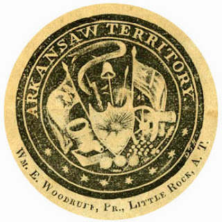 Le nom de l'Arkansas vient de la même racine que le nom de l'état du Kansas. La tribu amérindienne des Kansa sont étroitement associés avec les tribus sioux des Grandes Plaines. Le mot "Arkansas" est lui-même est une prononciation française "Arcansas" des indiens Quapaws qui signifie "lieu des hommes en aval". La prononciation de l'Arkansas a été officialisée par un acte de la législature de l'État en 1881. Il forma un territoire dès 1819, mais ne devint État qu'en 1836. Il fit partie des États confédérés d'Amérique du 6 mai 1861 jusqu'à la fin de la Guerre de Sécession en 1865. - Le Sceau de l'État de l'Arkansas (le sceau officiel est celui ci-dessus) a été adopté en 1864 d'après le sceau de l'ancien Territoire de l'Arkansas, créé par Samuel Calhoun Roane, et il a été modifié pour obtenir sa forme actuelle en 1907. Il est très complexe à décrire par le nombre impressionnant de symboles. On part du centre avec ce qui peut être considéré comme des armoiries : un écu tiercé en fasce où apparaissent en 1 :un bateau à vapeur, en 2 : une charrue, une ruche et en 3: une gerbe de blé, symboles de la richesse industrielle et agricole de l'Arkansas. L'écu est supporté par une aigle à tête blanche (Haliaeetus leucocephalus) au naturel, la tête contournée. L'aigle tient dans son bec un parchemin sur lequel est inscrite l'expression latine "Populus Regnat" ( Le peuple gouverne), la devise de l'État et dans ses serres : à dextre une branche d'olivier, à senestre un faisceau de trois flèches. L'écu est tenu à dextre de la main gauche par l'Ange de la Miséricorde avec l'extrémité du parchemin où est inscrit le mot "MERCY" (Grâce), dans sa main droite et soutenu à senestre par une épée posée en barre où est inscrit sur la lame le mot "JUSTICE". Au-dessus, dans un cercle de treize étoiles d’où émane un halo de rayons lumineux, figure la Déesse de la Liberté tenant une couronne de laurier dans la main droite et une lance coiffée d'un bonnet phrygien, dans la main gauche. L'extérieur du sceau contient le texte "THE GREAT SEAL OF STATE OF ARKANSAS" (Grand Sceau de l'État de l'Arkansas).