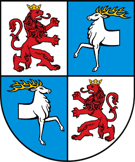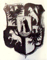 Description du (petit) blason: un écu coupé et mi-parti en pointe ; en premier d'azur au soleil issant d'or à 21 rayons : 11 larges et 10 étroits ; au deuxième d'argent au lion contourné de geules ; au troisième de gueules au griffon d'argent tenant une épée du même. L'écu est surmonté de trois étoiles à cinq branches d'or placées en arc de cercle en guise de cimier.
