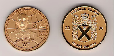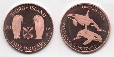 | drapeau et monnaies du "Grand-Duché de Westantarctica" (zone revendiquée par la Norvège) |