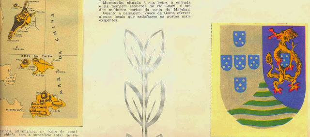 | extrait d'un livre montrant la carte du territoire à gauche et les armoiries de Macao en service jusqu'en 1999 |