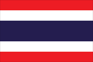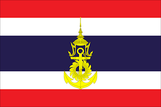 - Dans ce pays de Thaïlande les drapeaux et les pavillons sont extrêmement nombreux et variés, et si l'on remonte dans l'histoire, c'est une encyclopédie qu'il faut réaliser pour les répertorier tous ! (voir → ICI ) Nous allons nous limiter aux plus représentatifs : d'abord le drapeau civil et d'État : adopté le 28 septembre 1917 par décret du roi Rama VI. La version actuelle du drapeau thaïlandais présente trois couleurs rouge-blanc-bleu en cinq bandes horizontales avec une proportion de 2:2:4:2:2 (son nom thaï est ธงไตรรงค์, "Thong Trairong", signifiant "tricolore") : le rouge représente la nation, le blanc pour la foi et la pureté du bouddhisme theravada et enfin le bleu pour la monarchie. A côté, le drapeau du Roi Rama IX (1946-2016), jaune chargé d'un emblème : celui du jubilé du Roi. Au deuxième rang deux très beaux drapeaux, à gauche le pavillon de Marine ou pavillon de Guerre avec le maintien de l’éléphant blanc, symbole de l'ancien Siam et à droite le pavillon de beaupré, placé à l'avant des navires, chargé de l'emblème de la marine thaï . Et enfin au troisième rang deux étendards royaux avec la figure de Garuda, dans un dessin et des positions variés.