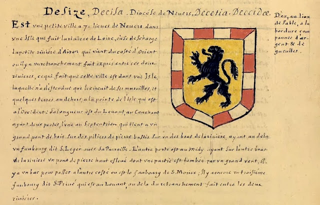 Ce nouveau volet va nous permettre de poursuivre avec le découpage administratif sous le règne de Louis XIV, en parcourant le Gouvernement Général d'Orléans. Cette entité était divisée en de nombreuses généralités , elles-même composées de sénéchaussées et de bailliages. Son territoire couvrait une immense région bordant la Loire et ses affluents, de l'Anjou à l'ouest jusqu'au Nivernais à l'est, le Poitou et le Berry au sud. Pour respecter l'ordre du manuscrit, nous continuons avec une province célèbre : l'ancien Comté de Nevers, rattaché au Duché de Bourgogne, et devenu Province (ici appelée Duché) du Nivernais durant l'Ancien Régime, qui correspond à quelques communes près au département actuel de la Nièvre avec de petits débordements sur le Cher et l'Yonne voisins. Ce sera également la dernière partie de l'exploration du Gouvernement général d'Orléans et le dernier volet pour l'année 2013.