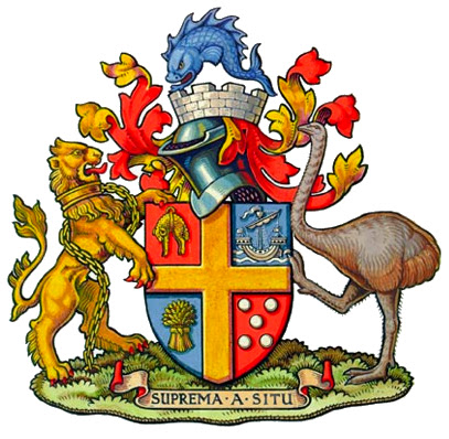 | ville de Wellington / Te Whanga-nui-a-Tara en langue maori capitale* de la Nouvelle-Zélande Les armoiries datent de 1878 , mais n'ont jamais été réellement officialisées par les autorités de la ville. L'écu est inspiré (croix et 4è quartier ) des armoiries de Lord Arthur Wellesley, duc de Wellington (en Angleterre) , le vainqueur de la bataille de Waterloo, dont la ville porte le nom en hommage. Les trois autres quartiers viennent des armes nationales et reprennent leur symbolique ( voir description dans mon blog de la 1ère semaine) Le cimier porte la couronne murale des villes et le dauphin précise que c'est un port maritime. Les supports sont le lion britannique, qui a brisé ses chaînes et un moa (voir ci-dessous). La devise peut être traduite par "Supérieure par sa position", le port de Wellington est en effet fort bien protégé dans une rade et par le détroit de Cook, passage entre les deux îles. blason du Duc de Wellington