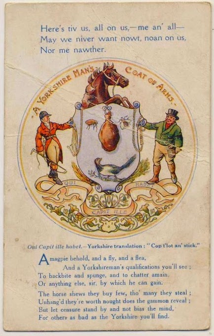 Mais bizarrement elles sont rédigées dans le dialecte du lieu ! Est-ce que ces cartes ( ce sont des cartes postales) étaient vendues dans le Yorkshire aux touristes anglais (du sud) de passage, pour se moquer d'eux ? Et en même temps se venger en leur prenant un petit bénéfice ! Je ne vois pas d'autre explication.
