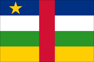 - Le drapeau de la République Centrafricaine a été présenté à l'assemblée législative le 1er décembre 1958 par le président Barthélémy Boganda quand l'Oubangui-Chari devint la République centrafricaine.Il est composé de quatre bandes horizontales égales, bleue pour la bande supérieure, puis blanche, verte et jaune vers le bas, et une bande verticale rouge de même largeur brochant sur l'ensemble, au centre du drapeau ; enfin une étoile d'or est placée dans la bande bleue près de la hampe. Ainsi, sont combinés le bleu, blanc et rouge du drapeau tricolore français et les couleurs panafricaines rouges, verts et jaunes , pour que "l'ancien colonisateur et le peuple africain marchent ensemble vers l'avant". L'idéalisme de l'époque et de Boganda, prévoyait de construire une sorte de fédération " d'États-Unis d'Afrique" en réunissant les états voisins : Tchad, Congo, etc... un projet qui n'a évidemment jamais vu le jour. L'étoile "guide les pas du peuple noir vers la liberté et l'émancipation". Au début était représentée une main dont l'index était pointé sur l'étoile du MESAN (Mouvement de l'évolution sociale de l'Afrique noire), comme dans les armoiries.