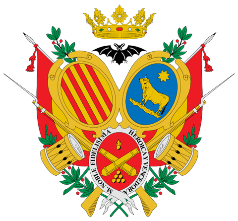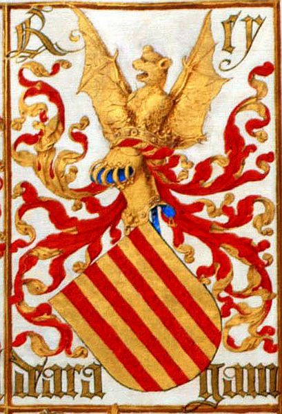 on y voit dans le cimier les anciennes armes d'Aragon : d'azur à la croix pattée et fichée d'argent |
