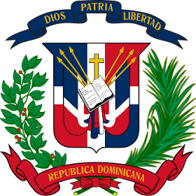 De part et d'autre de l'écu, une branche de laurier fruité et une palme au naturel placées en sautoir, liées par un ruban noué de gueules. Par dessus une banderole de gueules chargée des lettres capitales d'or formant le nom "REPUBLICA DOMINICANA" ; L'écu est surmonté d'une autre banderole d'azur, portant la devise en lettres capitales d'or " DIOS PATRIA LIBERTAD".