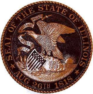 Le sceau d'État (seal) : Un aigle américain (Haliaeetus leucocephalus) perché sur un rocher tient dans son bec une banderole portant la devise d'état "State sovereignty, national union" (Souveraineté de l'état, union nationale); en dessous de l'aigle qu'il semble tenir dans ses serres, est un écu au couleurs du drapeau américain posé en barre sur une branche d'olivier. Sont également représentés une prairie, le soleil levant sur un horizon à l'Est sur le lac Michigan, et sur le rocher, les dates 1818 et 1868, années de création et de révision du sceau. Les mots "sceau de l'Etat de l'Illinois" et " le 26 août 1818" entourent l'ensemble.