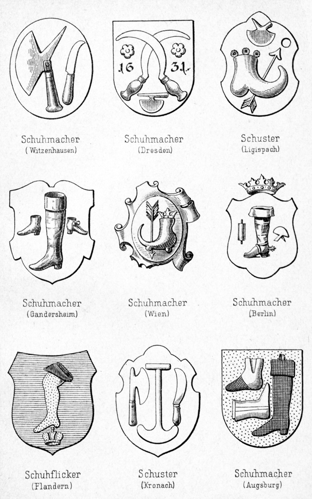 • Cette image surprenante avec une chaussure pointue, munie de crampons sous la semelle, accompagnée d'une flèche est assez répandue dans les emblèmes de corporations des pays germaniques. Ici on y a même rajouté une couronne, de marquis semble-t-il. Mais la symbolique de l'ensemble est difficile à cerner, par rapport au métier.