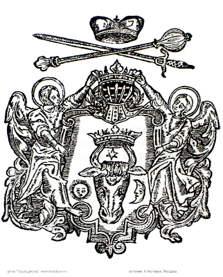 | Armoiries du prince Étienne III de Moldavie, reproduction coloriée d'armoiries originales sculptées (fondues) sur une cloche de l'église de Suceava. |
