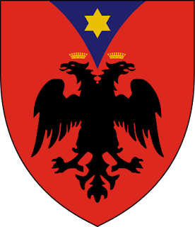 C'est un des blasons à "enquerre" les plus emblématiques ! en effet la règle de couleurs en héraldique proscrit d'associer un meuble de couleur "sable" sur un champ de "gueules", il devrait être d'argent ou d'or, comme les armoiries du Ministère de la Défense de la République albanaise, ci-dessous, à gauche. Toutefois si l'on considère que le "sable" est à l'origine une fourrure (voir ici →), comme l'hermine ou le vair, alors cette combinaison peut se justifier. De toute façon les albanais ne changeront pas de symbole, c'est leur marque nationale. Visuellement, ce n'est pas scandaleux ni choquant, comme peut l'être à l'inverse "azur sur sable" ou "azur sur sinople" !