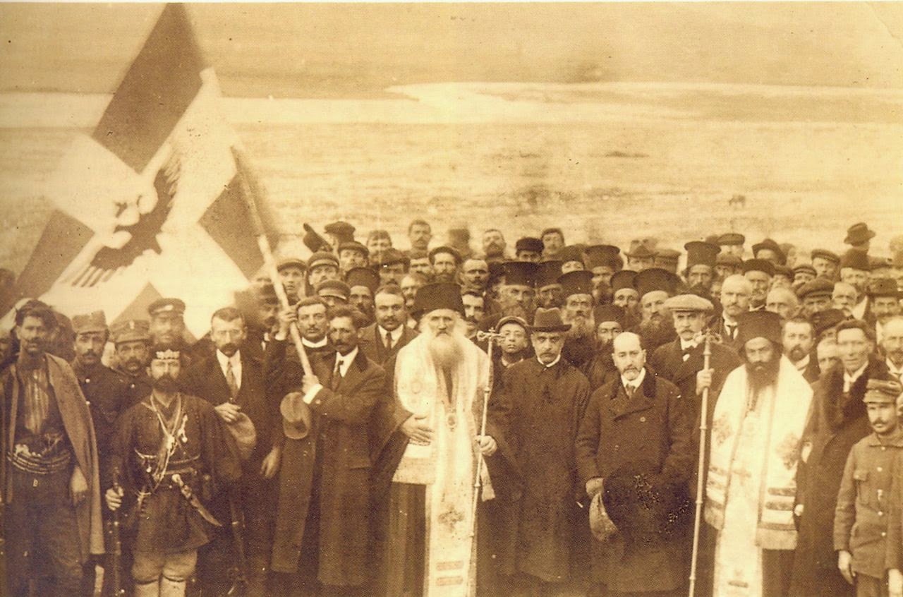 Autonomistes grecs d'Épire du Nord avec le drapeau lors de la déclaration officielle d'indépendance en mars 1914