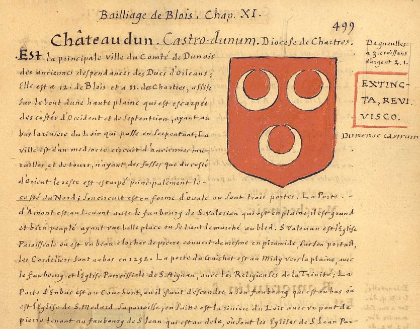 A noter que l'Armorial Général de France a enregistré un blason qui a été attribué "d'office" comme Blois, par les assistants de C. d'Hozier, ainsi qu'une graphie étrange abrégée : " Chãudun", le signe ~ remplaçant le "château",