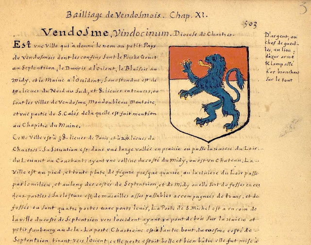 S uite de la visite d'un des plus anciens manuscrits répertoriant des armoiries de villes et de villages de France, dessinées à la plume et peintes à l'aquarelle, antérieur à l'Armorial Général de France de Charles d'Hozier de trois décennies ! Voir la description initiale : → ◙Ce nouveau volet va nous permettre de poursuivre avec le découpage administratif sous le règne de Louis XIV, en parcourant le Gouvernement Général d'Orléans. Cette entité était divisée en de nombreuses généralités , elles-même composées de sénéchaussées et de bailliages. Son territoire couvrait une immense région bordant la Loire et ses affluents, de l'Anjou à l'ouest jusqu'au Nivernais à l'est, le Poitou et le Berry au sud. Pour respecter l'ordre du manuscrit, nous continuons avec deux bailliages de l'Ancien Régime qui correspondent en gros au contour du département du Loir-et-Cher actuel, avec quelques petits débordements au nord et au sud. Ainsi se présentent le bailliage de Blois, basé sur un ancien Comté de Blois y compris le Dunois, le pays de Châteaudun et le bailliage du Vendômois découlant de l'ancien duché du même nom.
