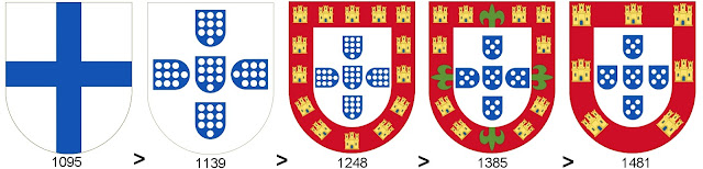 Évolution du blason du Portugal à partir de la croix d'azur, d'origine bourguignonne, avec l'année théorique d'apparition. |