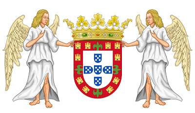 | armoiries des rois du Portugal de la Maison de Bragança (Bragance) - (règnes de 1640 à 1910) retour des dragons des ancêtres d'Aragon en supports. |
