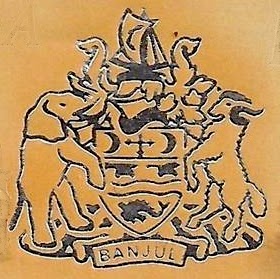 Sur des timbres de la poste gambienne (voir plus bas), figurent des armoiries complètes avec des ornements extérieurs : un heaume à lambrequins et un cimier représentant une barque à voile, ainsi que des supports : un éléphant et un bélier rampants, sur une terrasse "zébrée" .